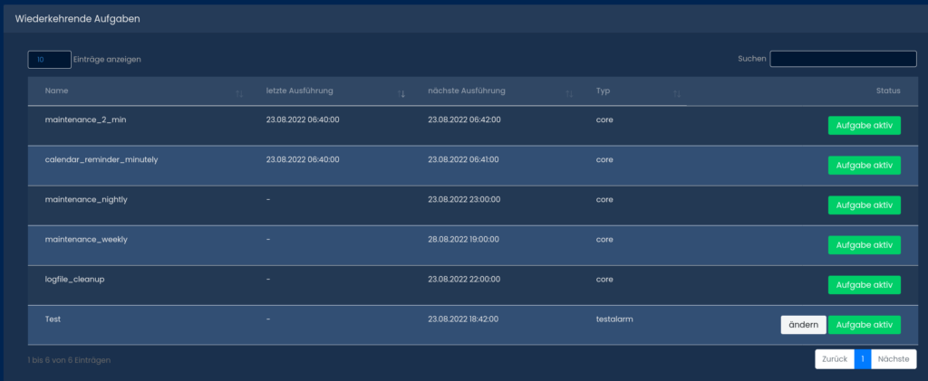 Du siehst hier eine Aufgabe "Test" das ist ein zeitgesteuerter Probealarm. Da dieser Wiederkehrend ist wird er hier aufgelistet. Du kannst hier auch wiederkehrende Aufgaben deaktivieren wir empfehlen jedoch die voreingestellten Aufgaben (diese sind nicht änderbar) aktiv zu lassen.