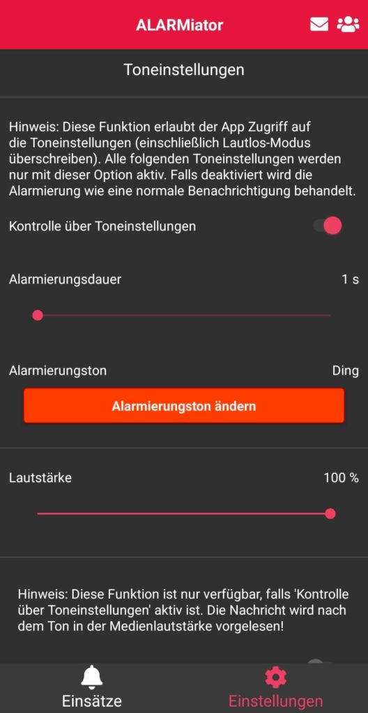 Damit dein Handy auch bei Stummschaltung Alarmierungen an dich weitergibt, muss Kontrolle über Toneinstellungen wie hier im Bild aktiviert sein.