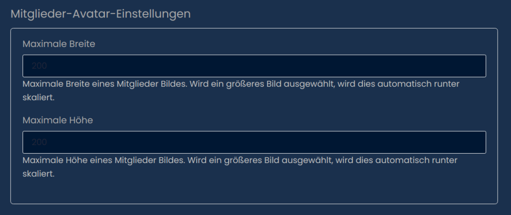 Ein Mitglied kann für seinen Account ein Profilbild hochladen. Hier kannst du einstellen wie groß das Bild maximal sein darf.