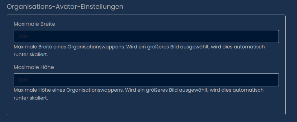 Hier kannst du die maximale Größe von Organisationswappen auf dem Server einstellen.