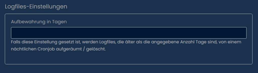 Solltest du die Logs nach einem gewissen Zeitraum löschen wollen, kannst du hier die angeben wie viele Tage die Logfiles aufgehoben werden sollen. Ist die Option nicht gesetzt, werden die Logfiles nicht gelöscht.