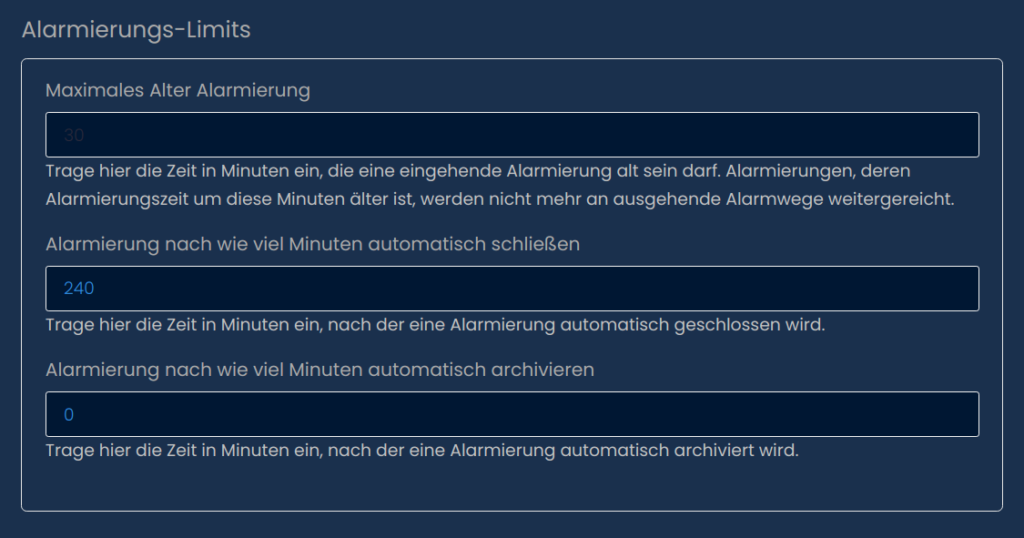 Steht die Archivierung auf 0 so muss man Einsätze nachdem Sie geschloßen wurden manuell archvieren. Es empfiehlt sich hier eine größere Zeitspanne zu wählen, für die automatische Archivierung. Nach einer Archivierung kann ein Einsatz nicht mehr geöffnet werden, um einen Einsatz nachzubearbeiten, falls Infos nachgetragen werden sollen.