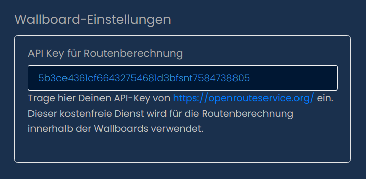 Solltest du ein Wallboard mit Routenberechnungsanzeige zum Einsatzort wollen, dann kannst Du online auf der Website des Anbieters https://openrouteservice.org/ kostenfrei einen Zugang erstellen. Die kostenfreie Variante gestattet aktuell bis zu 2000 Routing-Anfragen pro 24h.