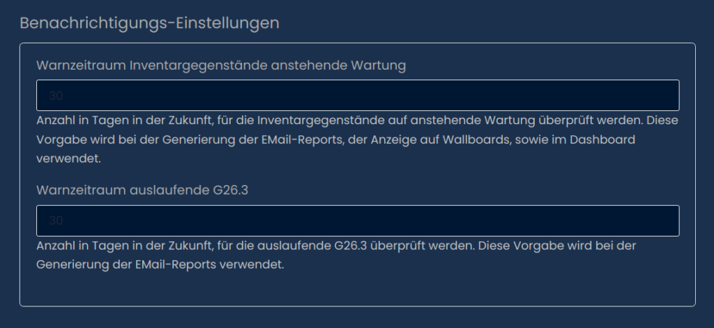 Hier kannst du einstellen wie viele Tage im Vorraus du über Wartungen und auslaufene G26.3 benachrichtigt werden möchtest.