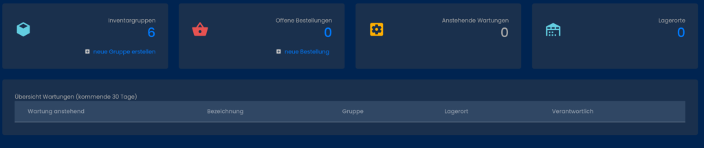📦 InventarInventar-ÜbersichtInventar-Übersicht Hier findest du eine Übersicht deiner Inventargruppen, Bestellungen und anstehenden Wartungen